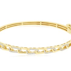 This 14k yellow gold necklace features 0.15ctw of baguettes and rounds set into a mosaic pendant with a halo. The chain is a delicate paperclip style.