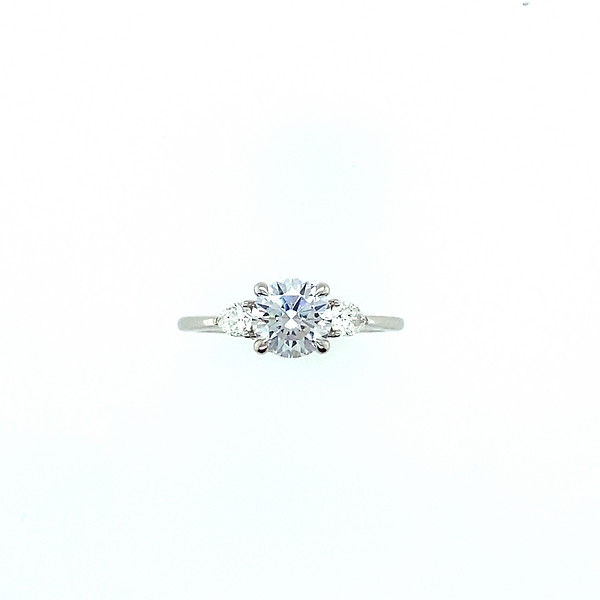 This 14k rose and white gold cathedral ring features a two-tone braided shank, and three oval diamonds, and two hidden sapphires on either side of the cathedral. The center oval is 0.50 ct with an I/SI2 color and clarity and the sides are 0.50ct total weight with an I/SI2 color and clarity as well. The diamond halos and shank have a total weight of 0.64ct.