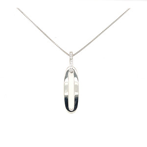 The pendant is an open oval style with a channel set white sapphire bail. The pendant is suspended from an adjustable box chain that can be worn 16'' or 18'' long.