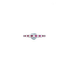 The band is a three row style. The outside rows are prong set round diamonds. The center row contains channel set blue sapphires that graduate in size towards the center of the ring. The sapphire total weight is 0.38ctw and the diamond total weight is 0.17ctw.