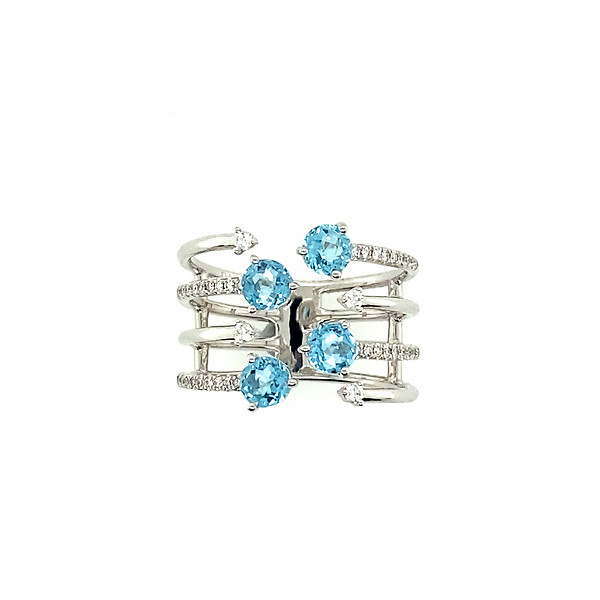 This sterling silver ring features a multi row design with one row being yellow plated, and 0.02ctw of diamonds bead set slightly off-center.