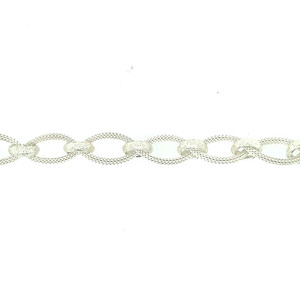 This sterling silver bracelet features oval shaped mesh links with diamond cut beads between the links.